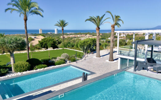 Strandseite, Nähe Golf, Nähe Meer, Ost, Süd, West, Ausgezeichnet, Klimaanlage, Meer, Panoramisch, Garten, Pool, Überdachte Terrasse, Einbauschränke, Private Terrasse, Solarium, Bad en Suite, Doppelverglasung, Teilweise möbliert, Vollmontiert, Privat, Einfache Wartung, Elektrische Rollos, Eingangstelefon, Alarm, 24-Stunden-Überwachung, Garage, Mehrere, Elektrizität, Trinkwasser, Telefon, Solare Warmwasserbereitung, Luxus